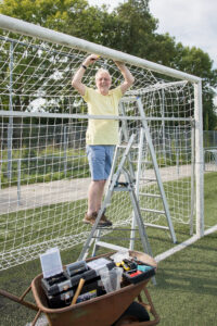 De technische ploeg bestaat uit een man of 5 aangevuld met 2 extra kanjers die we voor speciale projecten op kunnen roepen. Wij zorgen voor alle werkzaamheden die je kunt bedenken stoelen, doelnetten, sloten, douches, wasbakken repareren. Reclameborden plaatsen, groenonderhoud rondom het terrein. Eigenlijk de hele rimram, iedereen kan bij ons zijn of haar ei kwijt.